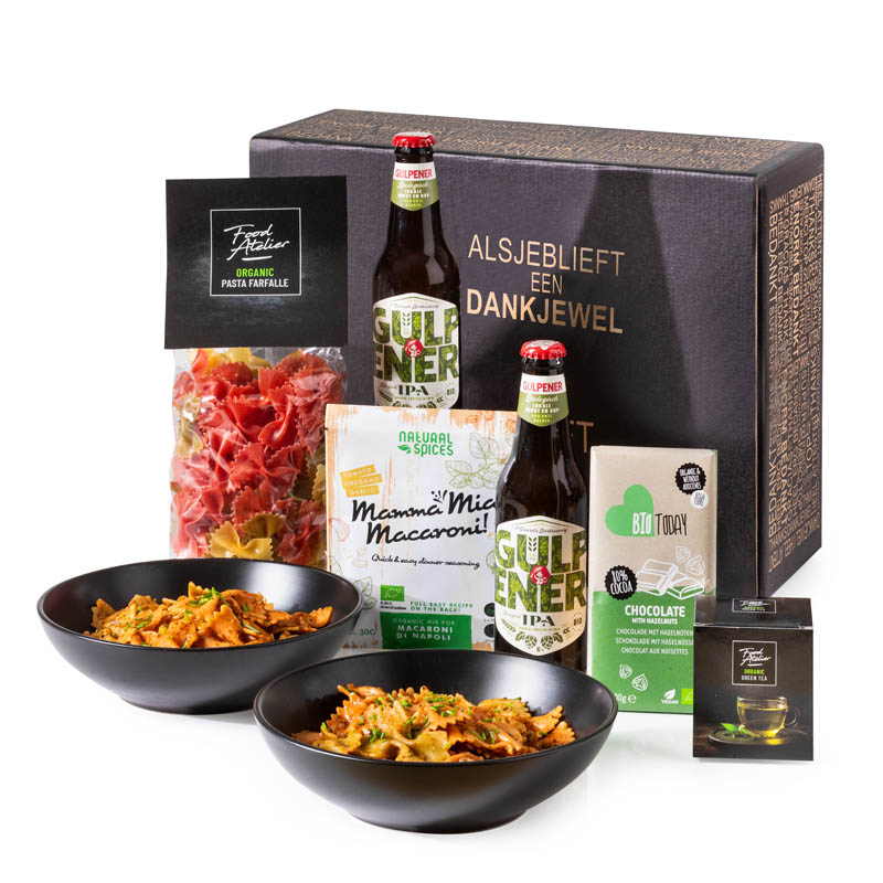 Voor de mensen die Biologisch wensen: een kerstpakket met biologische producten. Je maakt de biologische pasta in een handomdraai met deze ingrediënten en serveert ze uit in de pastaborden. Een glaasje biologisch bier zal hier zeker bij smaken. Nadien misschien een kopje biologische thee met Bio Today chocolade?