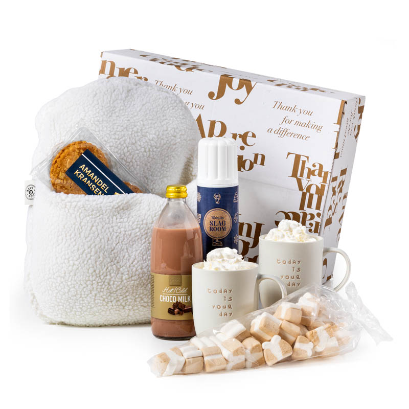Een warme slof van teddy stof, zo blijven je voeten lekker warm tijdens de koude wintermaanden. Dit kerstpakket is een winter kerstpakket pur sang en bevat naast de slof twee mokken om de chocomelk in op te warmen, vergeet daarna de slagroom niet! Dit kerstpakket bevat geen alcohol.